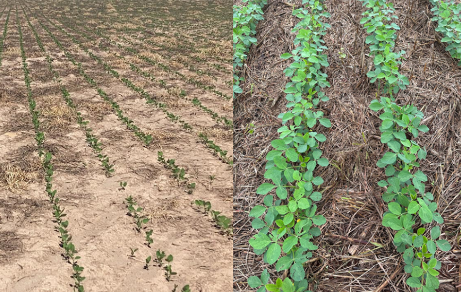 À esquerda, aspecto da lavoura de soja em fazendas que não investem em manejos que favorecem a saúde do solo, em comparação à Fazenda Santa Helena, que utilizou o plantio no verde